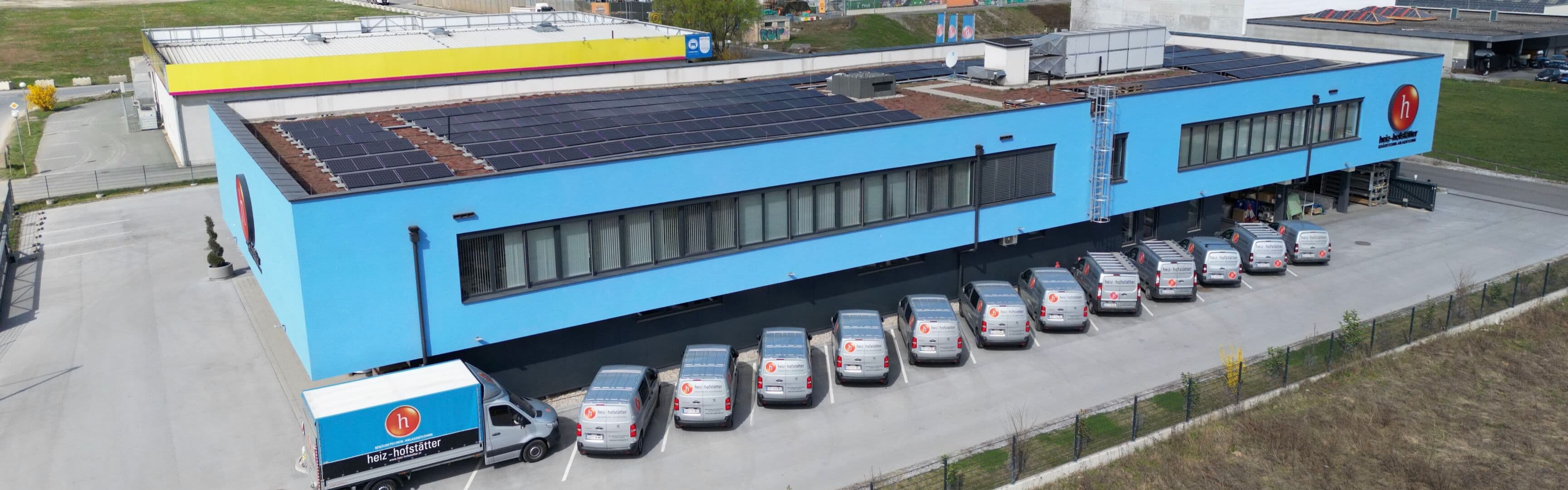 Die am Dach des Gebäudes situierte Kältemaschine wird im Winter als Wärmepumpe betrieben, die Stromversorgung erfolgt über eine betriebseigene Photovoltaikanlage. Somit erwarten die Mitarbeiter im Bürogebäude der Firma heiz–hofstätter großzügig angeordnete, modernst ausgestattete Büroräume in angenehmer komfortklimatisierter Atmosphäre.